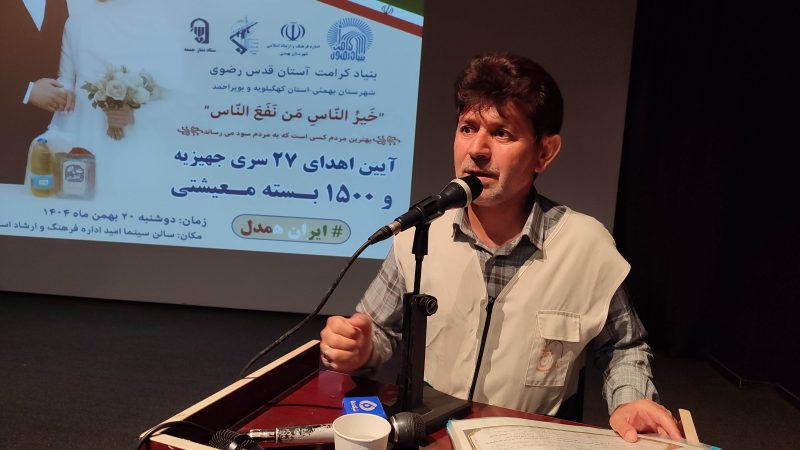 ستار هدایتخواه مسئول بنیاد کرامت آستان قدس رضوی در استان کهگیلویه و بویراحمد در آیین اهدای جهیزیه و بسته معیشیتی به نیازمندان بهمئی در که سالن اداره ارشاد برگزار شد، به تشریح برکات و خدمات نظام جمهوری اسلامی در حوزه رسیدگی به محرومان پرداخت.