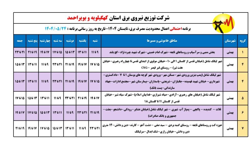 شرکت توزیع برق استان کهگیلویه و بویراحمد اعلام کرد که به دلیل گرمای هوا، کاهش تولید برق نیروگاه‌های برقابی ناشی از خشکسالی و تعمیرات نیروگاه اتمی بوشهر، شبکه برق سراسری با کاهش بیش از ۵۵۰۰ مگاوات تولید و ناترازی شدید مواجه شده است. برای جلوگیری از آسیب به زیرساخت‌ها و حفظ پایداری شبکه، دیسپاچینگ ملی مجبور به اعمال خاموشی‌های مقطعی است. از مشترکین درخواست می‌شود با رعایت دمای آسایش ۲۵ درجه سانتی‌گراد و استفاده از لوازم پرمصرف در ساعات کم‌باری (۲۳ تا ۶ صبح)، در حفظ پایداری شبکه برق همکاری کنند.