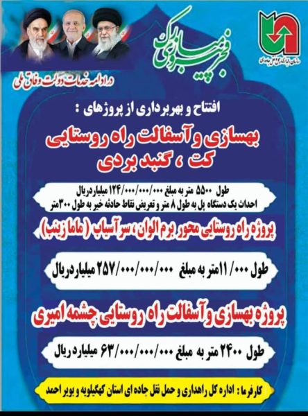 عالی‌نسب در ادامه به جزئیات پروژه‌ها پرداخت و بیان کرد: پروژه بهسازی و آسفالت راه روستایی کت – گنبد بردی: با طول ۵/۵ کیلومتر و اعتبار ۱۲۴ میلیارد ریال، شامل احداث یک دستگاه پل به طول ۸ متر و رفع نقاط حادثه‌خیز در مسیر به طول ۳۰۰ متر است.
